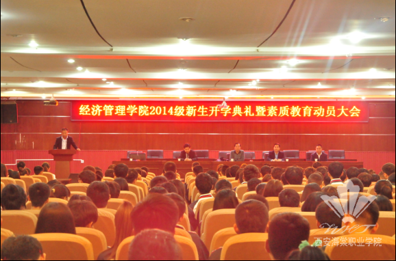 9月16日下午,经济管理学院2014级新生开学典礼暨素质教育动员大会在学术报告厅隆重举行。海棠职业学院学生处处长夏亚兵、教务处副处长张鼎、管理学院院长房宪俊、学院教授马贵民等领导和教师代表出席典礼,管理学院2014级全体新生和辅导员参加了开学典礼。典礼由管理学院学生科科长张应武主持。
