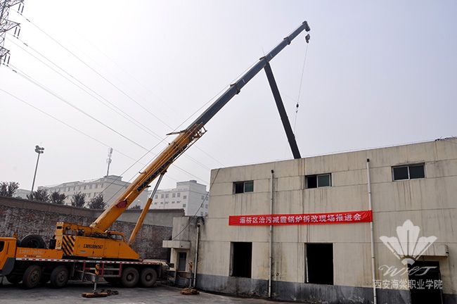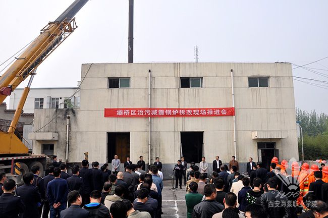 4月24日上午,在西安海棠职业学院举行的灞桥区燃煤锅炉拆改推进会的现场,灞桥区副区长杨爱民宣布“灞桥区第一批燃煤锅炉拆改工作正式启动”的话音刚落,在吊车的牵引下,海棠职业学院燃煤锅炉的烟囱缓缓落下,这是灞桥区燃煤锅炉拆改推进会现场最激动人心的一幕。出席本次推进会的领导有西安市环保局副局长颜昊,灞桥区副区长杨爱民,市环保局宣教处王涛,灞桥分局局长蒋涛,纺织城、狄寨街办副主任陶永宏,职院院长冯居秦、副院长赵景利。各街办环保专干、校内相关处室工作人员也到场参会。西安电视台等媒体对活动进行采访报道。