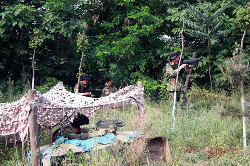 在拓展训练前,教练将全体教师分为两个组,每个组挑选出指挥官、队长各一名,每组成员发挥集体智慧,分别以“猎猪”和“狼牙”为队名,并绘制了队徽,确定了队伍口号。在基地培训师的指导下,两队队员分别进入指挥场所,展开激烈对战,奔跑的身影,尽情的呐喊,仿真的射击……瞬间训练基地成为了一片交织的绿色海洋。进攻、防守、包抄、诱敌,灵巧闪躲,快速占领,一切都只为了一个目标——领地是我们的!随着比赛进入白热化,越来越多的战士被“消灭”,最终在欢呼声中“狼牙”队取得了比赛的胜利。