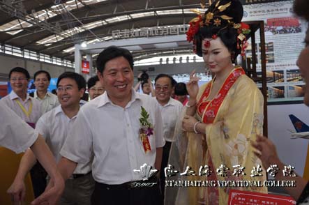 上午十一点,在大家热烈的欢迎下,省教育厅厅长杨希文兴致勃勃地走进我院展览厅,他称赞我们的展厅布置新颖,非常有特色,祝愿我院参展取得良好的效果,并祝海棠学院越办越好。最后,杨厅长还高兴地同院领导合影留念。