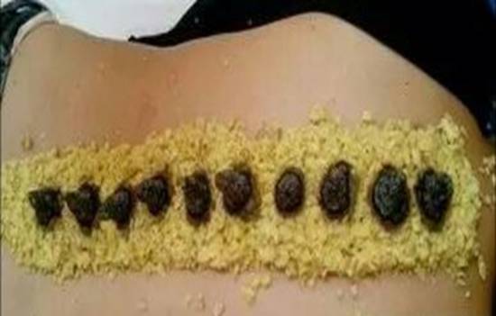 4、操作:在脊柱穴区常规消毒后,涂上蒜汁,在脊柱正中线撒上斑麝粉1—1.8g,粉上再铺以5cm宽、2.5cm高的蒜泥1条,蒜泥条上铺3cm宽、2.5cm高的艾绒(200g),下宽上尖。形成截面为等腰三角形的长蛇形艾炷。然后,点燃艾炷头、身、尾3点,让其自然烧灼。待艾炷燃尽后,再铺上艾绒复灸,每次灸2—3壮。